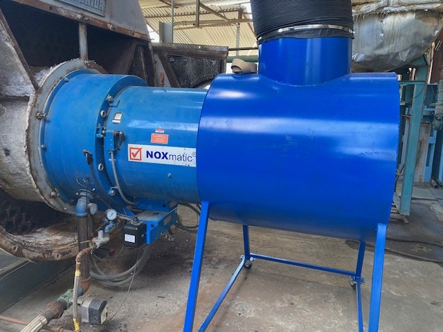Large 350 HP boiler startup August 2021, tests at 4ppm NOx, black ducting from plant (top center) connected to burner intake for VOC control and CA air permits to operate. This produces plenty of steam for all eighteen molding machines plus material preparation.