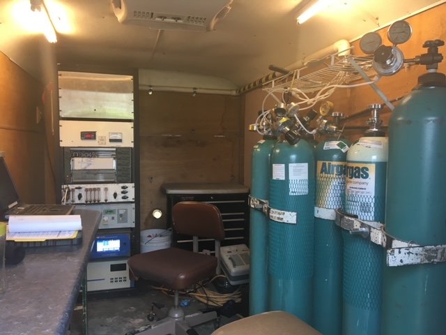 Air quality compliance tests require third party mobile lab testing of boiler stack (similar to auto smog test). Here the analyzers are printing real-time emissions data to compile test results. The analyzers are calibrated continuously with precise gases from the tanks on right.