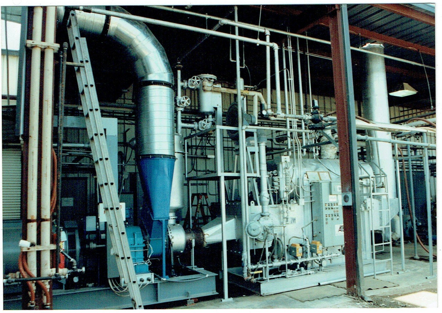 This is our second cogen system. Ducting from plant directs air to turbine combustor, hot exhaust feeds waste heat boiler to produce steam for molding machines. We produced electricity to operate the plant using 500 kw generator (on far left side).