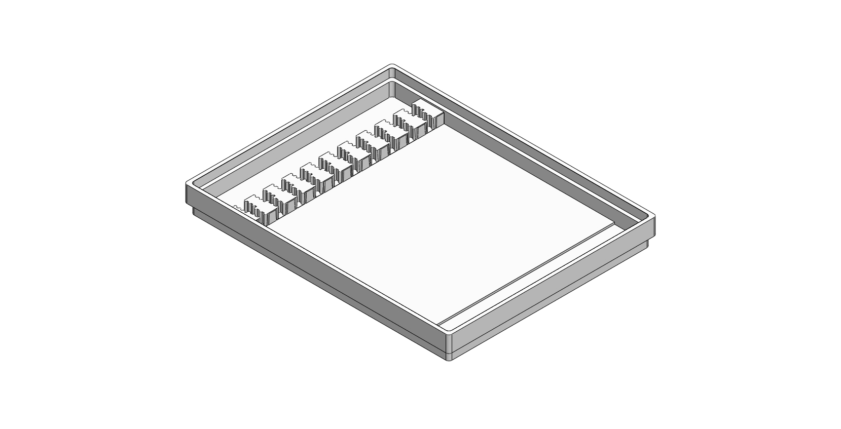 Open Fiber Tray-10 connector pockets | Open | Open | FCSP-10 | Static Dissipative tray with open area for fiber assemblies. 10 press-fit connector pockets, Stackable Trays. Press-fit fiber locks available as an option to gently hold bare fiber so end is held over the recessed end of tray. |