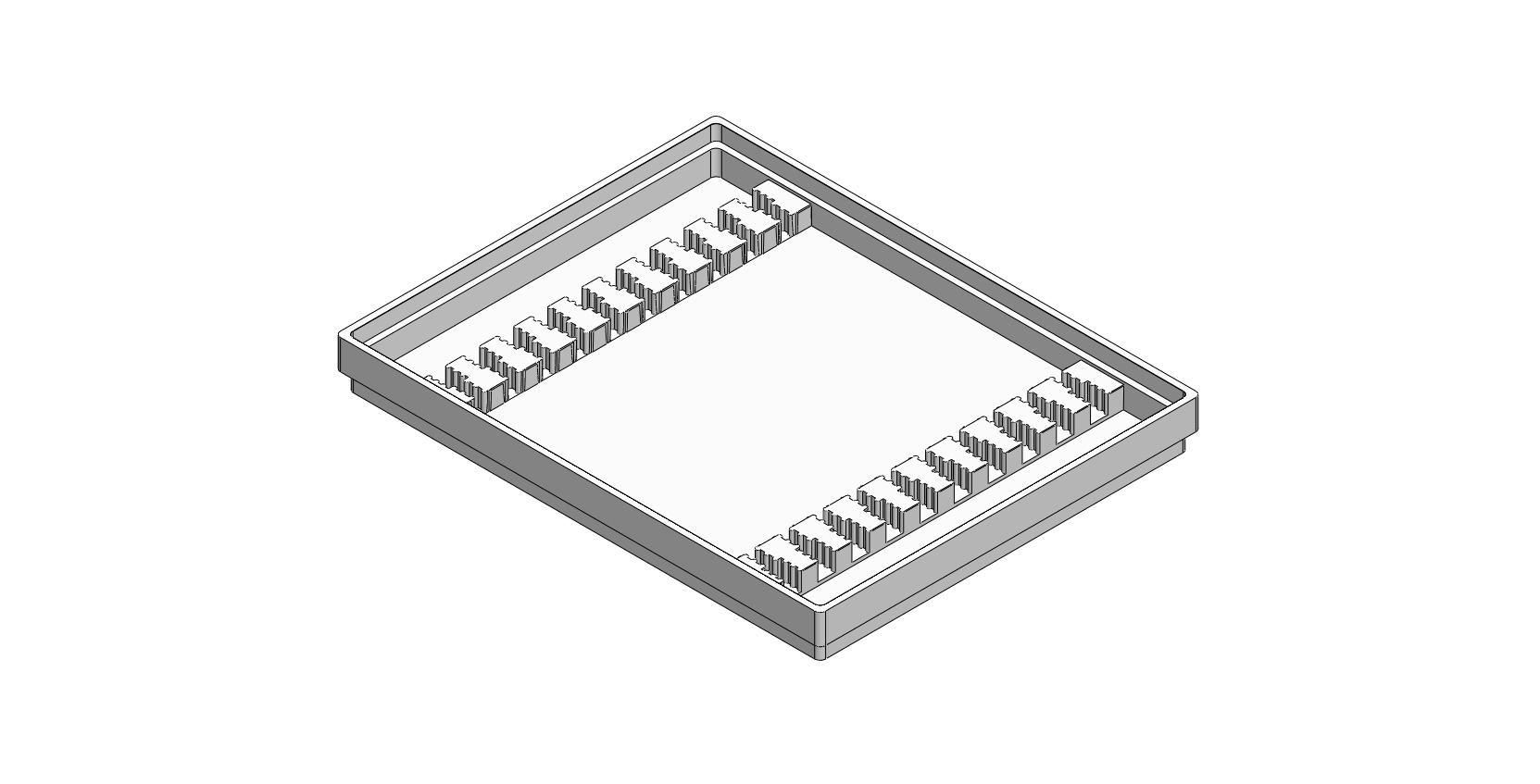 Open Fiber Tray-20 connector pockets | Open | Open | FCSP-20 | Static Dissipative tray with open area for fiber assemblies. 20 press-fit connector pockets, Stackable Trays. Press-fit fiber locks available as an option to gently hold bare fiber so end is held over the recessed end of tray. |