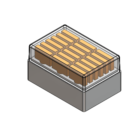1.87" square | 1.99" x 1.87" x 1.87" | 50.6mm x 47.7mm x 47.7mm | #4x4 | This 160 count box is Static Dissipative. It will hold parts 1.99” x 1.87” x 1.87” By using deeper lids (#202 deep lid shown in cross section), you can hold taller parts. Call for samples and assistance. |