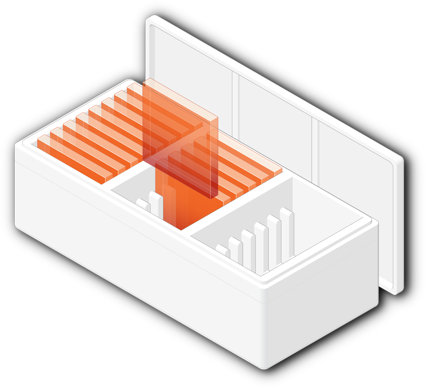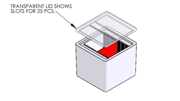 4" x 4" x .140" | 4" x 4' x .160" | 101 x 101 x 3.5mm | 25S-4062w | Static dissipative 25 count box and lid for 101mm square glass up to 4mm thick. Great for solar cell archiving. |